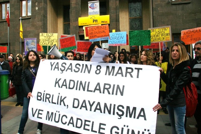 Sendika binası önünde toplanan ve çoğunluğunu kadınların oluşturduğu yaklaşık 100 kişilik grup Merkez PTT binası önüne kadar yürüyerek 8 Mart Dünya Kadınlar Günü’nde, kadına şiddeti protesto ettiler. Kürtçe pankart ve dövizlerin de taşındığı eylemde, grup üyeleri sloganlar atarak kadına şiddete ‘Hayır’ dediler. Eylemci grup adına basın açıklamasını okuyan Türkan Emren, kadının iş ve sosyal hayattaki yerinin her geçen gün azaldığını kaydederek, sürekli şiddete maruz kaldığını ifade etti. Kadınların eş, aile ve toplum tarafından yoğun bir baskı altında tutulduğunu, cinayetlere kurban gittiklerini söyleyen Emren, bu durumun düzeltilmesi için acilen kadının korunmasına yönelik yasaların çıkarılması ve kadınlar için ayrı bir bakanlık kurulmasını talep ettiklerini belirtti.
