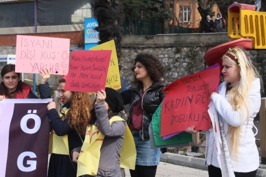 Çok sayıda katılımın olduğu etkinlik, basın açıklamasının ardından tiyatro gösterisiyle devam etti. Vatandaşların da yoğun ilgi gösterdiği tiyatro, kadının yaşadığı şiddeti ve Özgecan’ı izleyenlere farklı bir şekilde anlattı. Bülent Ecevit Üniversitesi Özgür Öğrenci Platformu adına açıklama yapan öğrenci Zelal Aydın, "1857 yılında Amerika’da tekstil sektöründe çalışan yüzlerce kadın, düşük ücretleri, uzun çalışma saatlerini ve insanlık dışı çalışma saatlerini protesto etmek için grevler yaptılar. Bizler bu kadınların baş kaldırmaları sayesinde bugün burada 8 Mart Dünya Emekçi Kadınlar Günü’nü anıyoruz. Bugün dünyanın her yerinde, her kentinde kadınlar eşitlik, adalet, özgürlük, emek ve dayanışma için seslerini ve isyanlarını birleştiriyorlar" dedi.
