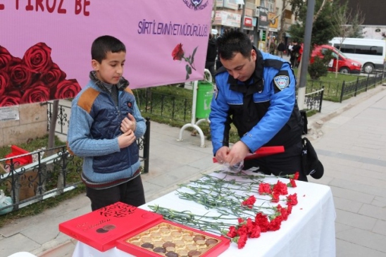 8 Mart Dünya Kadınlar Günü nedeniyle Siirt Emniyet Müdürlüğü 3 dilde pankart açıp kadınlara karanfil, çocuklara da çikolata verdi.