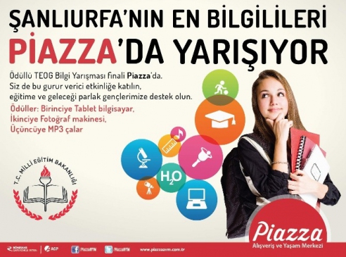 İl Milli Eğitim Müdürlüğü ve Şanlıurfa Piazza Alışveriş ve Yaşam Merkezi’nin öğrencilerin TEOG sınavlarına hazırlanmalarına yardımcı olmak amacıyla düzenledikleri bilgi yarışması, tüm heyecanıyla devam ediyor. Koordinatörlüğünü Şanlıurfa TÜBİTAK Projeleri Sorumlusu Mehmet Nuri Öğüt ve Şenocak Ortaokulu Müdürü Güney Aksoy’un üstlendiği bilgi yarışmasında, okullarını temsil eden öğrenciler 34 eleme ve yarı final mücadelesi sonucunda finallere katılmaya hak kazanacaklar.