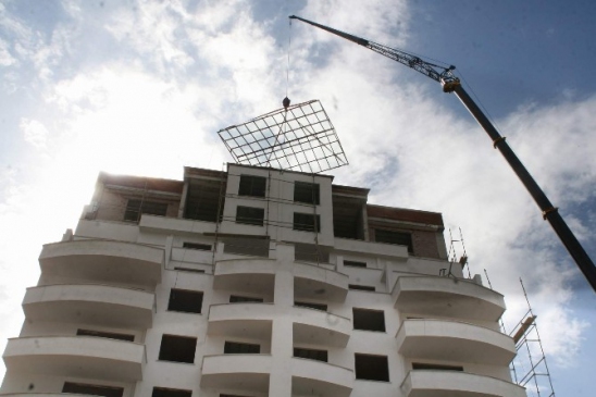 Trabzon’un Çukurçayır Mahallesi’nde Trabzon’da ilk kez denenin bir yöntemle yaklaşık 50 metre yükseklikteki binanın çatısına vinç yardımıyla 3 buçuk ton ağırlığında aydınlatma çatısı yerleştirildi.