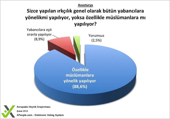 Avusturya ve Almanya'da yapılan bir anket, bu ülkelerde yaşayan Müslümanlara yönelik saldırıların arttığını, her üç kişiden ikisinin en az bir kez ırkçı saldırıya maruz kaldığını gösterdi. Türk mühendisler tarafından geliştirilen "XPeople" adlı elektronik oylama sistemiyle "Avrupa'da Irkçılık Araştırması" kapsamında bir anket yapıldı. Ankette, ırkçılığın özellikle Müslümanlara yönelik yapıldığını düşünenlerin oranı Avusturya'da yüzde 88,6 oldu.Muhabir: XPeople