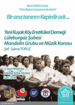 ’Bir Ana Tanırım Kepirdir Adı’ ismiyle düzenlenecek olan konser Lüleburgaz Belediyesi, Yeni Kuşak Köy Enstitüler Derneği, Çağdaş Yaşamı Destekleme Derneği ve Türkiye Emekli Öğretmenler Derneği’nin desteğiyle gerçekleştirilecek. ’Onlar Bozkırı Tutuşturan Kıvılcımlardı’ sloganıyla Köy Enstitüleri anısına düzenlenecek konserde, Yeni Kuşak Köy Enstitüleri Derneği Lüleburgaz Şubesi Mandolin Kursu ve Müzik Korosu Belediye Kültür Merkezi’nde Şef Saime Topuz yönetiminde 12 Mart Perşembe günü saat 20:00’de Belediye Kültür Merkezi’nde sanatseverlerle bir araya gelecek.