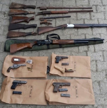 Evlerde yapılan aramalarda 5 gram kenevir tohumu, 4 adet tabanca, 2 adet ruhsatsız av tüfeği ile bunlara ait şarjör ve mermiler ve tüfek parçaları ele geçirildi.