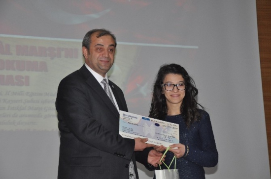 Yarışmaya 16 ilçeden öğrenciler katıldı. İstiklal Marşını en güzel okuma yarışmasında birinciliği Talas Fatma Kemal Timuçin Anadolu Lisesi’nden Canan Koşu birinciliğin, Yahyalı Yahya Gazi Anadolu Lisesi’nden Hatice Meltem Biçici ikinciliğin ve Develi Anadolu İmamhatip Lisesi’nden Şerife Danacıoğlu üçüncülüğün sahibi oldu.