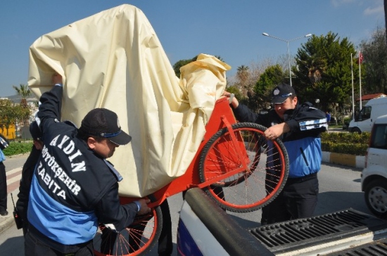 Aydın Büyükşehir Belediyesi ile Kuşadası Belediyesi zabıta ekipleri ilçe genelinde bir yıldır kullanılan seyyar tezgahları kaldırmaya başladı.
