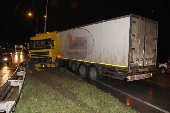 Kaza, İlkadım ilçesi Samsun Yusuf Ziya Yılmaz Otobüs Terminali karşısı çevre yolundan meydana geldi. Edinilen bilgiye göre, Mükerrem Demir (50) idaresindeki 52 K 5924 çekici ve 52 K 5393 dorse plakalı TIR, Ankara istikametine seyir ederken sağanak yağış dolayısıyla kayarak makaslama yaptı ve orta refüje çıkıp bariyere çarptı. TIR sürücüsü kazayı yara almadan atlattı. Yolun tek şeridi uzun süre araç trafiğine kapalı kaldı.