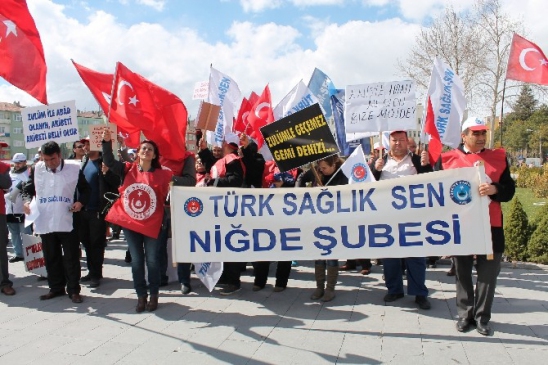 Türk Sağlık-Sen Niğde Şube Başkanı Adnan Özer yaptığı açıklamasında şunları söyledi; “Başbakan’ın katılımıyla Sağlık Bakanlığının düzenlediği “Şifa veren Ele Vefa” toplantısı düzenlendi. Öncelikle belirtmek isteriz ki Bakanlık iç bir zaman Sağlık çalışanlarına vefa göstermemiştir. Şifa veren elleri sorunları ve dertleri ile baş başa bırakmıştır. Süslü toplantılarla bu işi geçiştirmeyi adet edinmiştir. Bu toplantıda Sayın Başbakan sağlık çalışanlarının haklarıyla ilgili bazı açıklamalar yapmıştır., Nöbet ücretlerine yüzde 50 zam yapacağız demiştir. 1 Saatlik nöbet ücreti bir doktor için şuan 7 TL, ebe hemşire arkadaşlarımız için 4.7 TL’dir. Bu komik ücretlerin yüzde 50 artması çok büyük bir müjdemidir?. Sağlık çalışanları olarak ne lütuf bekliyoruz, ne de karşılanamaz talepleri dile getiriyoruz, sadece hakkımızı talep ediyoruz. Haklı taleplerimizi dile getirmek ve çalışanları taleplerinin karşısındaki vurdumduymazlığa tepki olarak Tıp Bayramı arifesinde iş bırakıyoruz” dedi.