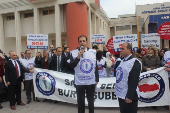 Bursa Dörtçelik Çocuk hastanesi Sağlık Sen üyesi sağlık çalışanları, yıpranma payı ve ek ödemelerin emekliliğe yansımamasını protesto etti. Sağlık-Sen adına açıklama yapan Bursa Şube Başkanı Gökhan Yünkül, "Sağlık çalışanlarının umutla beklediği, yıpranma payı, ek ödemelerin emekliliğe yansıması gibi hususlarda yapılan açıklamalar ve değinilmeyen lisans tamamlama ve kreş hakkı gibi konular nedeniyle 14 Mart Tıp Bayramında hayal kırıklığı yaşıyoruz. Bize müjde olarak açıklanan nöbet ücretlerinde yüzde 50 oranında artışı, çalışanlar olarak memnuniyetle karşılıyoruz. Nöbet ücretleri dışında sağlık çalışanları olarak, uzun yıllardır mücadelesini verdiğimiz yıpranma payı ve ek ödemelerinin emekliliğe yansıması konularında ise Sağlık Bakanlığı yetkililerinin bizleri yanılttığı ortadadır. Sağlık-Sen olarak, taleplerimizin olduğu kadar verilen sözlerin hayata geçmesi konusunun da takipçisi olmaya devam edeceğiz. Bizler Sağlık Sen üyeleri olarak işimize sahip çıktığımız ve işimizi bırakmadığımız gibi, hedefe ulaşana dek bu işin peşini de asla bırakmayacağız" dedi.