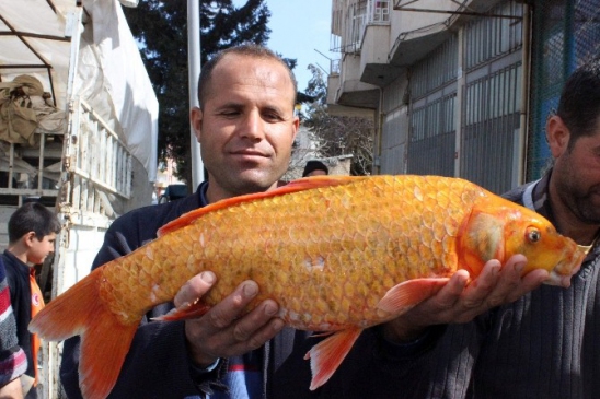 Adıyaman Atatürk Barajı Kızılcapınar mevkisinde balık avlayan balıkçının ağlarına ilk kez farklı bir balık takıldı. Balıkçıların ağlarına yaklaşık 5 kiloluk turuncu renge yakın balık takıldı. Ağına takılan bu tür balığı ilk kez gördüğünü dile getiren Mehmet Korkmaz, “20 yıldan beri balıkçılık yapıyorum. Yıllardan beri Atatürk Barajı’nda balık avlarım ama hiç böyle bir balık türüyle karşılaşmadım. Gölette yarım kilo gelen İsrail sazanı dediğimiz bu renkte balık var ancak, ilk kez bu renkte aynalı sazan görüldü. Balıkçı arkadaşlarımda bu tür balığa rastlamadıklarını dile getirdi. Balıkçı arkadaşlar bu balığa ‘Altın balık’ ismini verdiler” dedi.