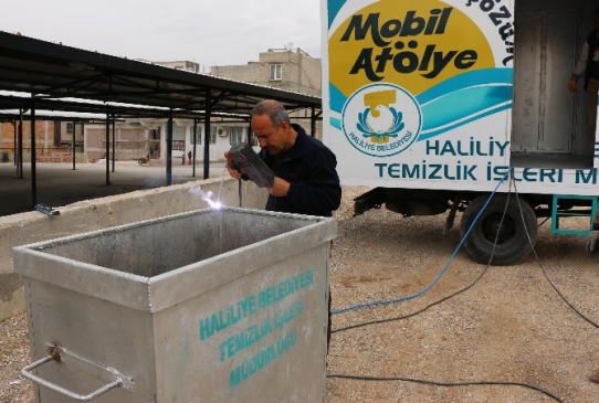 Şanlıurfa Haliliye Belediyesi Temizlik İşleri Müdürlüğü bünyesinde faaliyete geçirilen Mobil Atölye ile çöp konteynırlarının bakımlarına yerinde müdahale ediliyor.