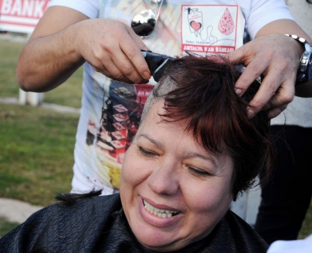 Sosyal paylaşım sitesi Facebook’da kurulan Antalya Kan Bankası grubu üyesi 30 kişi, kan ve trombosit arayan hastalara destek olmak ve farkındalık oluşturmak amacıyla saçlarını kazıttırdı.