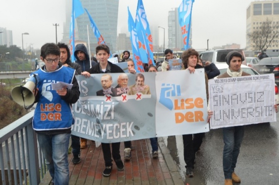 Levent’te bulunan ÖSYM binasını önünde toplanan Lise Der üyesi bir grup lise öğrencisi, bugün gerçekleşen YGS’yi protesto etti. Protesto öncesi polis bina önünde güvenlik önlemi aldı. Sloganlar atarak ÖSYM binası önüne gelen grup adına açıklama yapan Berra Özinan, “Bizler 12 yıl boyunca yeteneklerimize ve ilgi alanlarımıza göre olmayan eğitimden sonra üç saatlik sınavlarda geleceğimizin karartılmasına izin vermiyoruz. Bunun için meydanlardayız ve sınavsız üniversite talebimizi haykırıyoruz. Hayatlarımızın üç saatlik hatalı sorularla dolu sınavlara göre yönelmesine izin vermiyoruz. Yükseköğretim hakkımızı istiyoruz. Yeteneklerimize göre üniversiteye yerleşmek istiyoruz” dedi.