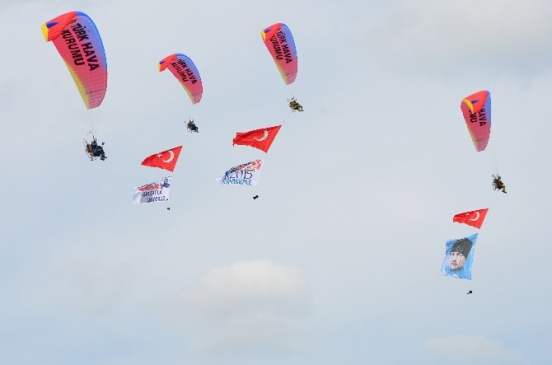 Türkiye’de ilk defa 4 motorlu yamaç paraşütü ile Çanakkale Savaşları’nın 100. yılı nedeniyle saygı uçuşu gerçekleştirildi. Şehitlikler üzerine karanfiller bırakılarak, gökyüzünde pano açıldı. Gösteri, THK tarafından havadan da görüntülendi. Etkinlik hakkında bilgi veren THK Genel Başkanı Vacit Ökten, gökyüzünün engin mevkilerinde saygı uçuşunu başarı ile gerçekleştirdiklerini belirterek, "Şanlı zaferin 100. yılında dört ayrı motorlu yamaç paraşütçümüz, ay yıldızlı bayrağımızı, Ata’mızın posterini ve ’100’üncü yılda gururluyuz, şehitlerimizi saygıyla anıyoruz’ mesajlarını içeren panomuzu boğazın iki yakasında dalgalandırdı. Gökyüzünün engin mevkilerinde saygı uçuşumuzu başarıyla gerçekleştirdik. Çanakkale Şehitleri Abidesi’nin üzerinde ’Her zaman kalbimizdesiniz’ yazısı ile halkımızın duygularına tercüman olmaya çalıştık. Paraşütçülerimiz şehitlerimizin kabirlerinin üzerine gökyüzünden kırmızı-beyaz karanfiller bıraktı" dedi.