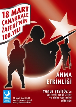 Çanakkale Zaferi’nin 100.yılı münasebetiyle Aliağa Belediyesi anlamlı bir etkinlik düzenliyor. Çanakkale’de hayatını kaybeden şehitler için düzenlenecek etkinlikte, zaferin yüzüncü yılı için Yunus Yeşilöz tarafından seslendirilecek şiirler, katılımcıları 100 yıl önceki savaşa yeniden götürecek. 18 Mart Çarşamba günü saat 20.00’de Aliağa Belediyesi Çok Amaçlı Sosyal Tesisleri Sinema Salonu’nda başlayacak programda ayrıca, Çanakkale Destanı’nı anlatan kliplerin gösterimi de yapılacak.