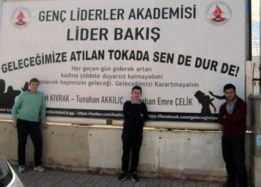 Uluslararası Antalya Üniversitesi’nin bu yıl ikincisini düzenlediği "Genç Liderler Akademisi" yarışmasında katılan Halil Akyüz Anadolu Lisesi 11’inci sınıf öğrencileri İsmet Kıvrak, Tunahan Akkılıç ve Tunahan Emre Çelik’in "Geleceğimize Atılan Tokada Sen De Dur De" adlı projelerinin bilboard ve el broşürü çalışmalarını hazırladı.