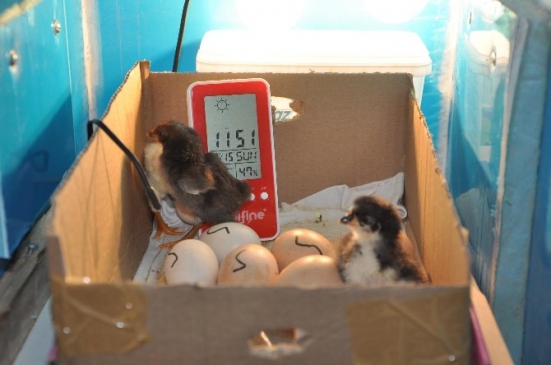 Sorgun’da 9 yıldır esnaflık yapan 3 çocuk babası Hüseyin Şahbaz, evde beslediği 12 tavuğundan yeteri kadar verim alamayınca çareyi kuluçka makinesi yapmakla buldu. Kuluçka makinesine 21 gün önce koyduğu 10 yumurtadan 3 tanesinden civciv çıktı. Mikrodalga fırınının motoru ve tabağı, bilgisayar fanı, dijital termostat, zaman rolesi, ampul, nemlendirme kabı, sandviç paneli kullandığı kuluçka makinesini yaklaşık 30 günde tamamlayan Şahbaz, ilk civcivlerini almanın mutluluğunu yaşadı.