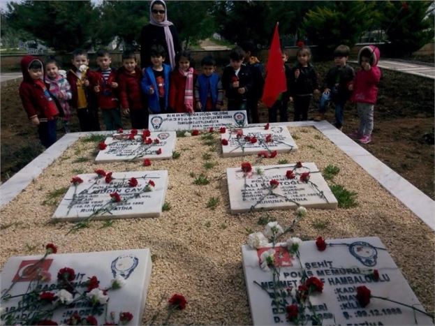 Çanakkale Zaferi’nin 100. Yıl dönümü nedeniyle İlk Adım Kreş ve Gündüz Bakım Evi yöneticileri Filiz Özçil, Mehmet Ali Özçil ile öğretmenler ve öğrenciler, Asri Mezarlıkta şehitliği ziyaret ederek, şehitlerin mezarlarına çiçek bıraktılar.