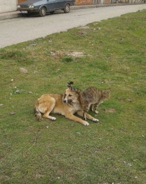 Yoldan geçen vatandaşlar kedi ve köpeğin dostluğunu fotoğraflayarak ölümsüzleştiriyor.