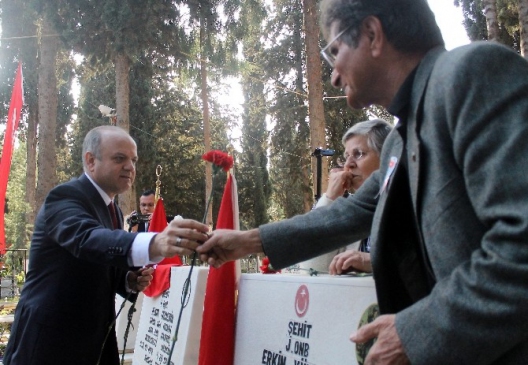 Mezarlıkta bulunan şehitlikte düzenlenen törene, Mersin Valisi Özdemir Çakacak ile eşi Kevser Çakacak, Akdeniz Bölge ve Garnizon Komutanı Tuğamiral Nejat Atille Demirhan, Büyükşehir Belediye Başkan Vekili Kerim Tufan, İl Emniyet Müdürü Rahmi Baştuğ, İl Jandarma Komutanı Kıdemli Albay Ömer Uyar ile çok sayıda rütbeli askeri personel, şehit ve gazi yakınları katıldı. Tören, şehitler için bir dakikalık saygı duruşu ve İstiklal Marşı’nın okunması ile başladı. Saygı duruşunda askerler tarafından havaya 3 defa ’saygı’ atışı yapıldı. Ardından, çelenk sunumları yapıldı.