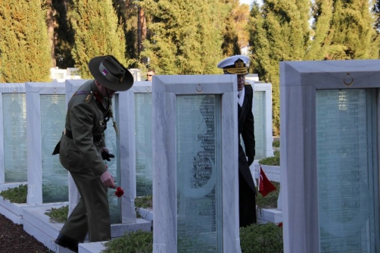 Çanakkale Şehitler Abidesi’nde düzenlenen törene katılan Anzak komutan, şehit Mehmetçiklerin mezarlarına karanfil bırakıp, asker selamı verdi.