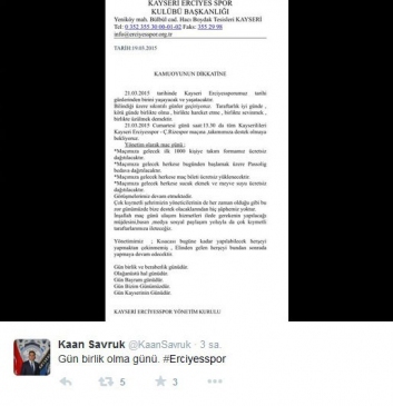 Savruk, sosyal medya hesabından yaptığı açıklamada, "21.03.2015 tarihinde Kayseri Erciyesspor’umuz tarihi günlerden birini yaşayacaktır. Çaykur Rizespor maçına tüm taraftarımızı bekliyoruz. Siz değerli taraftarımızı takımımıza destek olmaya bekliyoruz. Suat Altın İnşaat Kayseri Erciyesspor Yönetimi olarak maç gününde bazı kararlar aldık. Maça gelecek olan ilk bin kişiye takımımızın formasını hediye edeceğiz. Maçın Passolig biletlerini bugünden itibaren ücretsiz yapıyoruz. Maça gelecek herkese sucuk ekmek ve meyve suyu ikramında bulunacağız" ifadelerini kullandı.