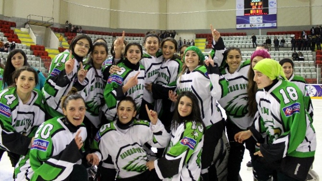 Türkiye Buz Hokeyi Federasyonu (TBHF) Kadınlar Ligi Play-Off final maçını 5-1 kazanarak şampiyonluğunu ilan eden Narman Spor Kulübü’nün sporcuları buz üzerinde halay çekerek, şampiyonluklarını kutladı.
