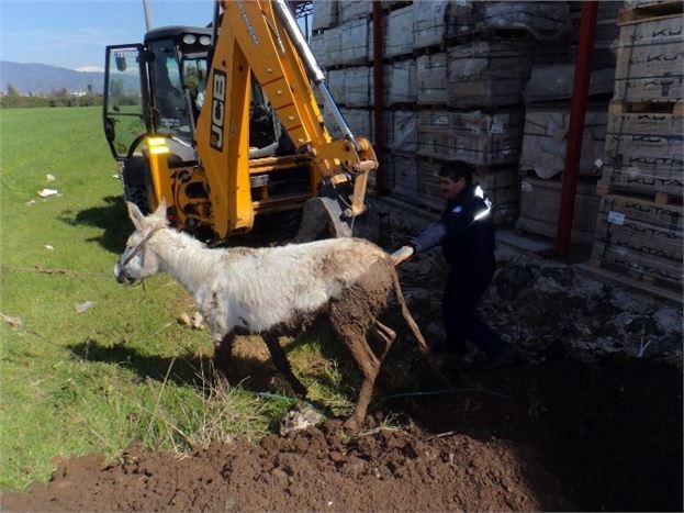 İtfaiye ekipleri kepçe yardımı ile iki metre derinlikteki çamura saplanan eşeği çıkararak sahibine teslim etti.