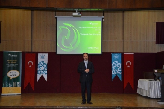 Başkan Eşkinat’ın konuşma sonrası söz alan ÇEVKO Vakfı Eğitim Şefi Murat Anaç, geri dönüşümün tarihçesi, tekrar kullanım, türlerine göre geri dönüşüm, ambalaj üzerindeki işaretlerin anlamları, atıkların geri dönüşümü ve geri dönüşümün faydaları konularında sunum yaptı.