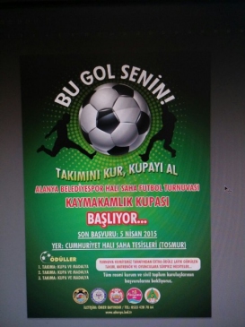 İlki geçen yıl düzenlenen "Bu Gol senin" Alanya Belediyespor Halı Saha Futbol Turnuvası (Kaymakamlık Kupası) başvuruları başlıyor. Geçen yıl resmi kurum ve sivil toplum kuruluşlarından oluşan 40 takımın katılımıyla gerçekleşen "Bu Gol Senin" Alanya Belediyespor Halı Saha Futbol Turnuvası’na bu yıl bayanların da katılımı sağlanacak.