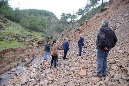 Kumluca Belediye Başkanı Hüsamettin Çetinkaya ve Orman İşletme Müdürü Mehmet Şakir Güneri, Büyükşehir Belediyesi Koordinatörü Yusuf Evran ile Kumluca Belediyesi Fen İşleri Müdürlüğü teknik ekibi heyelan bölgesinde incelemelerde bulunarak, yol açma çalışmaları konusunda fikir alışverişinde bulundular.