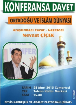 Düzenlenecek olan konferans ile ilgili BİKAP’tan yapılan yazılı açıklamada; 28 Mart 2015 Cumartesi günü saat 15.30’da Tatvan Belediyesi Kültür Merkezi’nde düzenlenecek olan konferansa konuşmacı olarak gazeteci-araştırmacı yazar Nevzat Çiçek’in katılacağı ve herkesin davetli olduğu belirtildi.