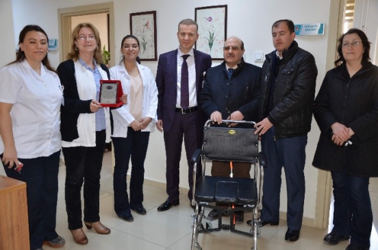 Ziyarete Devlet Hastanesi Yöneticisi Uzm. Dr. Murat Çilekar, Hastane Başhekim Yardımcısı Uzm. Dr. Gamze Mumcu ve hastane çalışanları katıldı. Başkan Yardımcısı Selahattin Oktay, Sosyal İşler Yardım Sekreteri A.Kadir Aydın, Dernek Sekreteri Hatice Şentürk’ün de katıldığı ziyarette Dernek Başkanı Kaçer, ”Zübeyde Hanım Fizik Tedavi ve Rehabilitasyon Merkezi yöneticileri tarafından derneğimize sürekli olarak ilgi gösterilmektedir. Bizler için damla damla biriktirdikleri mavi kapakları bağışlayarak birçok engelli insana destek olmakta moral ve güç vermektedirler. Biz de bir adet tekerlekli sandalyeyi hastanemize bağışlamak istedik” şeklinde konuştu.