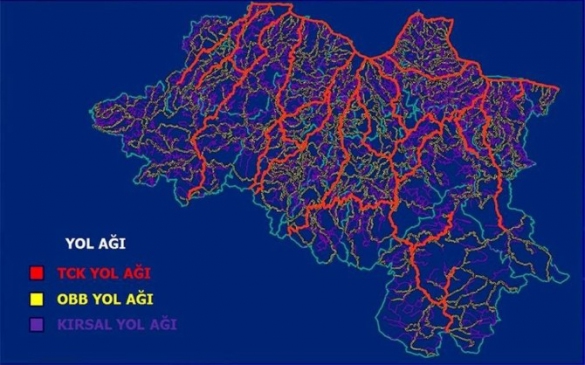 Uydu görüntülerinden yararlanılan çalışma sonunda Ordu ilinin adeta kılcal damarlarını oluşturan yol ağı Ordu’nun engebeli coğrafyasının özelliğini bir kez daha ortaya serdi.