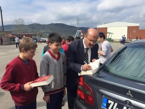 Bartın Milli Eğitim Müdürü Yaşar Demir, örnek davranış gösteren öğrencilere kitap takdim etti.