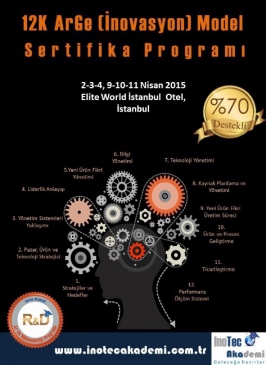 Geçtiğimiz yıl bu alandaki çalışmaları ile ün salmış InoTec Teknoloji ve Yönetim Danışmanlığı danışmanları tarafından ülkemizde ilk defa dünyada çok az benzeri görülen bir sistem tanımlaması yapılmış, inovasyon kavramının tüm süreçleri 83 kriterle tariflenerek şirketlerin Ar-Ge merkezlerinin başarısı ölçümlenebilir hale getirdi. Yaklaşık bir yılı aşkın süreden bu yana başarı ile uygulanan sistem sayesinde onlarca şirket kendi inovasyon yetkinliklerini analiz ettirerek gelişim için yol haritası belirleme fırsatı elde etti. 12K Ar-Ge model olarak isimlendirilen bu kriterlerin tüm detaylarının ele alınacağı ve katılımcıların bir bilgisayar uygulaması ile kendi şirketlerinin mevcut durumunu analiz edeceği Ekonomi Bakanlığı tarafından yüzde 70 oranında desteklenen Sertifika Programı, 2 Nisan 2015 tarihinde Elite World Hotel Taksim’de başlayacak ve 6 gün sürecek.