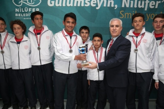Fethiye İdmanyurdu'nun U-14 kategorisinde namağlup şampiyonluk kazandığı 6. Uluslararası Manavgat Cup Futbol Turnuvası sonrası sporcular, kupa sevincini Nilüfer Belediye Başkanı Mustafa Bozbey ile paylaştı. Turnuva, Antalya’nın Manavgat ilçesinde gerçekleştirildi ve Fethiye İdmanyurdu, 8 takımın yer aldığı kategoride 5 galibiyet, 2 beraberlik ile şampiyonluğu elde etti. Şampiyon takım, kupayı her zaman destek veren Başkan Bozbey’e takdim etmek üzere Başkanlık Makamı’na ziyarette bulundu. Bu ziyarete Nilüfer Belediyesi Başkan Yardımcıları, Meclis Üyeleri, Fethiye İdmanyurdu Başkanı Şenol Tosun, Takım Antrenörü Ceyhun Kurtlar ve yöneticiler katıldı. Kulüp Başkanı Şenol Tosun, birçok oyuncunun Türkiye Süper Ligi takımlarının ilgisini çektiğini belirterek, “Desteklerinden dolayı Nilüfer Belediyesi’ne ve Başkanımız Mustafa Bozbey’e teşekkür ediyorum” dedi. Başkan Bozbey ise, “Bu tür başarılar, uluslararası alanda takımımızın ve Nilüfer’in isminin duyulması açısından çok önemli. Fethiye İdmanyurdu'nun hedefi her zaman şampiyonluk olmalı. Nilüfer Belediyesi olarak sporun ve sporcunun yanında olmaya devam edeceğiz” ifadelerini kullandı. Başkan Bozbey, Manavgat’tan dönen futbolculara hediyeler takdim etti.