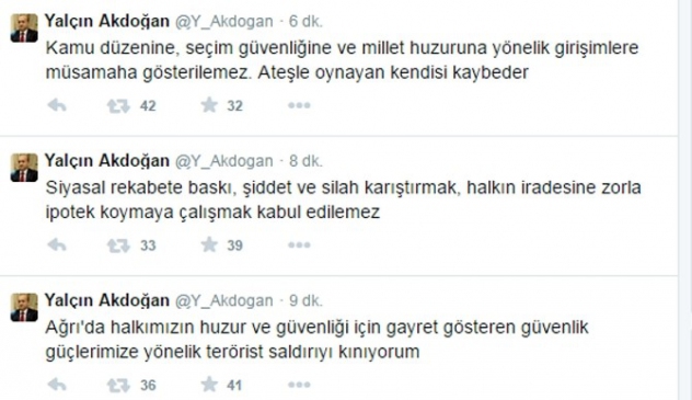 Ağrı'da gerçekleşen olayda, PKK'ya yakın bir partiye oy verilmesi amacıyla askerlerin etkisi altına alınmaya çalışıldığı iddiaları gündeme geldi. Askerlerin bu baskılara karşı durduğu sırada, PKK'lıların düzenlediği silahlı saldırı sonucunda 4 asker yaralandı. Hükümet kanadından ilk tepki Başbakan Yardımcısı Yalçın Akdoğan'dan geldi. Akdoğan, Twitter üzerinden yaptığı paylaşımda, güvenlik güçlerine yönelik terörist saldırıyı kınayarak, "Ağrı'da halkımızın huzur ve güvenliği için mücadele eden güvenlik güçlerimize karşı gerçekleştirilen bu saldırıyı şiddetle kınıyorum. Siyasal rekabette baskı ve şiddet kullanmak, halkın iradesini zorla etkilemeye çalışmak kabul edilemez. Kamu düzenini, seçim güvenliğini ve milletin huzurunu tehdit eden girişimlere asla izin veremeyiz. Ateşle oynayan kendisi kaybeder" ifadelerini kullandı.