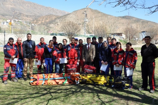 Gümüşhane Merkez'de, Ulusal Medikal Kurtarma Ekipleri (UMKE) personeline özel bir eğitim kampı yapıldı. İl Sağlık Müdürlüğü'nde Acil ve Afetlerde Sağlık Hizmetleri Şube Müdürü Alptekin Giresunlu'nun koordinatörlüğünde gerçekleştirilen kamp, Bağlarbaşı Mahallesi’ndeki Sema Doğan Parkı'nda düzenlendi. 14-16 Nisan tarihleri arasında yapılan bu eğitim programına, Gümüşhane genelindeki sağlık kurumlarından 14 UMKE personeli ve 5 eğitmen katıldı. Katılımcılara dar alanda hasta/yaralı müdahalesi, temel yaşam desteği, ileri yaşam desteği, zor şartlarda hayatta kalma, fiziksel kondisyon ve afet stres yönetimi konularında hem teorik hem de pratik eğitimler verildi. Konuyla ilgili açıklama yapan İl Sağlık Müdürü Dr. Mustafa Ağar, Gümüşhane'de toplamda 34 UMKE gönüllüsü bulunduğunu, yılsonuna kadar eğitimlerle bu sayıyı arttırmayı hedeflediklerini belirtti. Daha önce Erzurum Bölge UMKE Koordinatörlüğü görevini yürüten ve şu anda Gümüşhane Kamu Hastaneleri Birliği Genel Sekreteri olarak görev yapan Dr. Özgür Çelebi ile birlikte eğitim kampını ziyaret eden Ağar, eğitimi yerinde inceledi. Eğitimin bölge risklerine göre planlandığını vurgulayan Ağar, katılımcılara başarı dileklerinde bulunarak Gümüşhane Belediyesine destekleri için teşekkür etti. Eğitim sonunda eğitmen ve katılımcılara belgeleri, Dr. Mustafa Ağar, Dr. Özgür Çelebi, Alptekin Giresunlu ve Ufuk Yazıcı tarafından verildi.