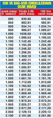 SSK ve Bağ-Kur emeklilerine 2016 Ocak ayından itibaren %3,86 oranında enflasyon zammı uygulanacak. Enflasyon zammı uygulandıktan sonra tüm SSK ve Bağ-Kur emeklilerine ayrıca 100,00 T.L. tutarında da seyyanen zam verilecek.