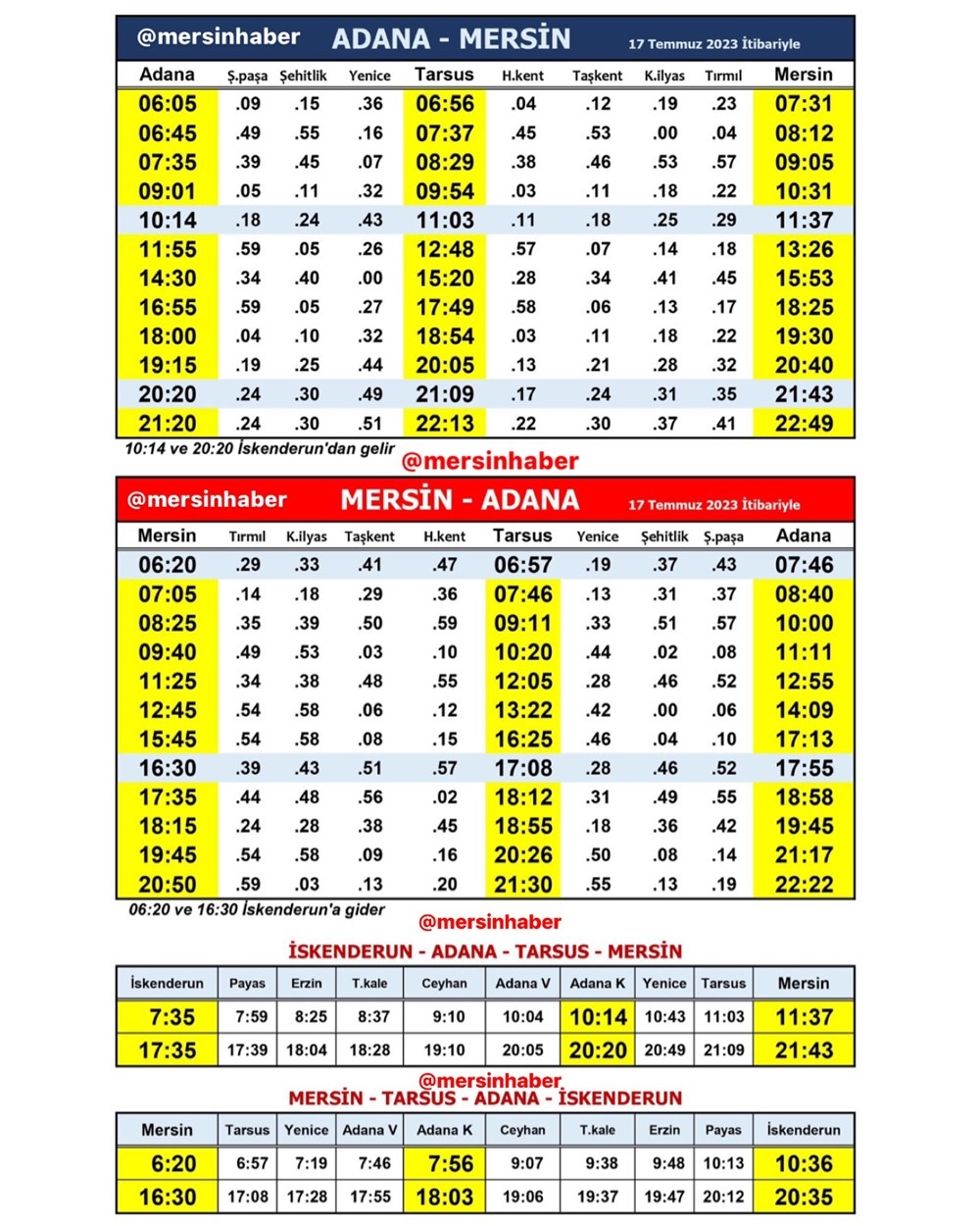 Mersin-Tarsus-Adana arası yolcu taşımacılığı yapan bölgesel tren saati 17 Temmuz tarihi itibari ile güncelleniyor. Yeni tren seferi saatleri şu şekilde olacak;