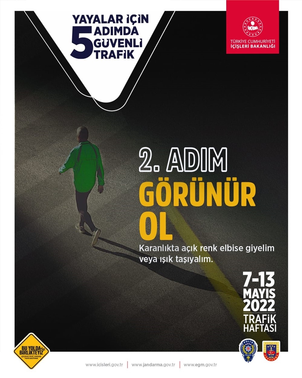 “Yayalar İçin 5 Adımda Güvenli Trafik” mottosunun etkin olarak kullanılması ve tanıtılması amacıyla 07.05.2022 Cumartesi günü saat 11:00’de ülke genelinde eş zamanlı olarak tüm il ve ilçelerimizde vali, kaymakam ve kolluk amirlerinin katılımıyla il/ilçede belirlenen noktada medya kuruluşları da davet edilerek vatandaşlarımıza kampanya hakkında bilgilendirme yapılacak.