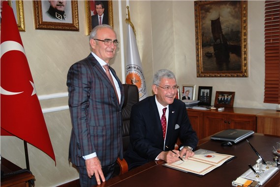 SAMSUN - Türkiye'nin AB'ye Üyelik Süreci konulu Sivil Toplumla Diyalog Toplantısı'na katılmak üzere Samsun’a gelen Avrupa Birliği Bakanı (AB) ve Baş Müzakereci Büyükelçi Volkan Bozkır, Samsun Büyükşehir Belediye Başkanı Yusuf Ziya Yılmaz’ı ziyaret etti. Ziyarette Başkan Yılmaz, Bakan Bozkır’a kent ekonomisinin gelişme süreci ile spor ve turizm gibi alt yapı çalışmaları hakkında bilgi verdi.
