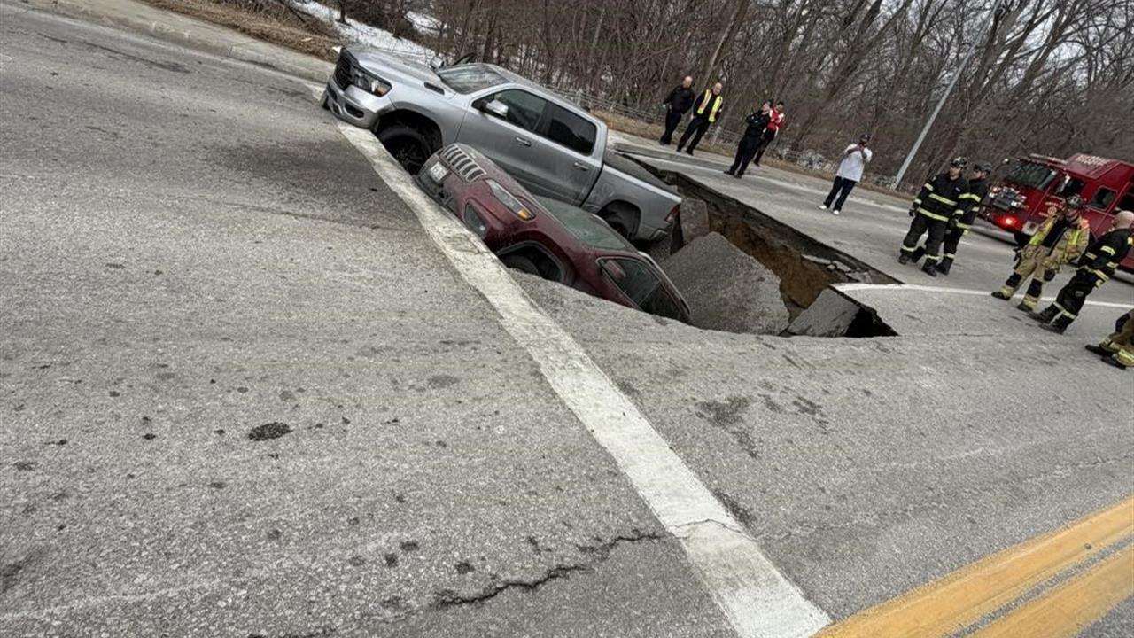 Nebraska'nın Omaha şehrinde, kırmızı ışıkta bekleyen iki araç yolun çökmesi sonucu bir çukura düştü.