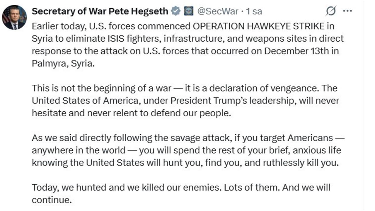 ABD, Suriye'nin Tedmur bölgesinde DEAŞ'a yönelik "Hawkeye Strike Operasyonu"nu başlattığını açıkladı. Başkan Trump, Suriye hükümetinin bu operasyonu desteklediğini ve terörist unsurlara karşı sert bir uyarıda bulunduğunu ifade etti. Trump, "Burası sorunlarla dolu; ancak DEAŞ ortadan kaldırılabilirse parlak bir gelecek bizi bekliyor" dedi. Operasyonun, 13 Aralık'taki saldırıya bir yanıt olduğunu belirten ABD Savunma Bakanı Pete Hegseth, "Bu bir savaş başlangıcı değil, intikam ilanıdır" şeklinde konuştu.