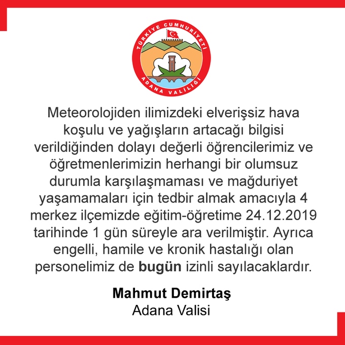 Adana Valiliğinden yapılan açıklamada, "Meteorolojiden ilimizdeki elverişsiz hava koşulu ve yağışların artacağı bilgisi verildiğinden dolayı değerli öğrencilerimiz ve öğretmenlerimizin herhangi bir olumsuz durumla karşılaşmaması ve mağduriyet yaşamamaları için tedbir almak amacıyla merkez Seyhan, Çukurova, Yüreğir ve Sarıçam ilçemizde eğitim-öğretime 24 Aralık 2019 tarihinde 1 gün süreyle ara verilmiştir" denildi.