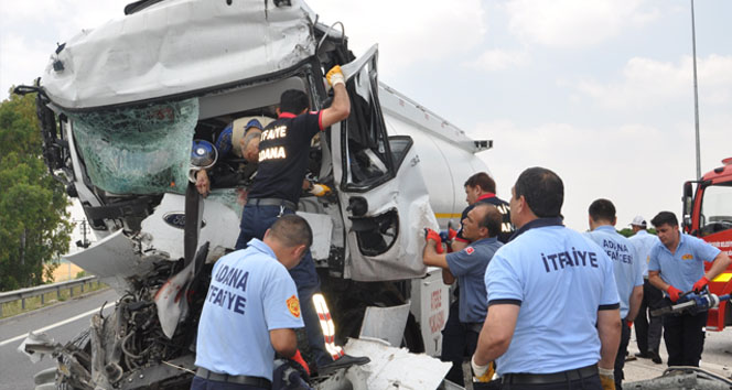 Adana'nın Ceyhan ilçesinde, TAG otoyolu batı çıkışında akaryakıt yüklü bir tanker TIR'a arkadan çarptı. Edinilen bilgilere göre, 60 yaşındaki Durdu Ceyhan yönetimindeki tanker, Ceyhan istikametine giderken, Hüseyin Şahin'in kullandığı TIR'a arkadan çarptı. Çarpmanın etkisiyle tankerin sürücüsü aracın içinde sıkıştı. TIR sürücüsü Hüseyin Şahin, kaza yerine gelen ambulansla hastaneye kaldırıldı.