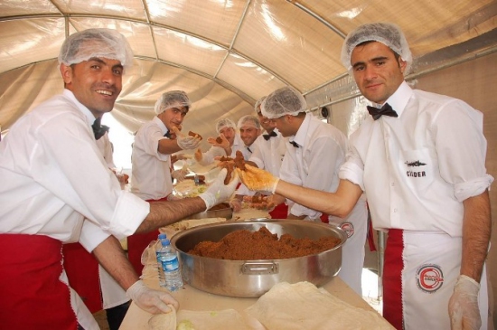 Adıyaman Sincik ilçesinde Cumhurbaşkanı Recep Tayyip Erdoğan'ın gerçekleştireceği ziyaret öncesinde, Çiğköfteciler Derneği (Çiğ-Der) tarafından 2 ton çiğköfte hazırlandı. Sincik'te halka hitap edecek olan Erdoğan, bu etkinlikte binlerce kişiye çiğköfte ikram edilecek. Çiğ-Der Yönetim Kurulu Başkanı Ömer Turan, Cumhurbaşkanı’nın Sincik’e gelmesinin kendileri için büyük bir onur olduğunu belirtti. Turan, "Bugün burada 2 ton çiğköfte yoğruldu ve halka dağıtılacak. Şampiyonluk bizim temennimiz. Biz esnaf olarak üzerimize düşeni yapmaya her zaman hazırız" dedi.