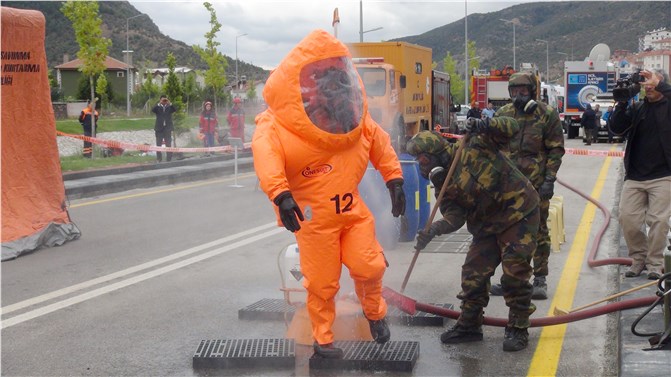 Deprem anında oluşan araba kazasından sonraki anları canlandıran ekipler, kaza yapan araçtaki kimyasal maddelerin zarar vermesini önlemek için yapılması gerekenleri gösterdi. Kaza bölgesinde soğuk, ılık, sıcak bölge diye üç bölge oluşturuldu. Ekipler, soğuk bölgede kimyasal maddeden etkilenmemek için radyoaktif elbise giydi. Soğuk bölge ile sıcak bölge arasında kayıt masası kuruldu. Radyoaktif madde tespit edilen yerleri ellerinde getirdikleri işaretlerle sıcak bölgeyi işaretledi. Yaralıları çıkarmadan önce toz dökerek radyoaktif alanları kapattı. Araç içerisindeki kişilere ilk müdahale yapıldı. Yaralılara maske ve koruyucu elbise takıldı. Daha sonra ilk yardım ekipleri sıcak bölgeye girerek yaralıları sıcak bölgeden çıkarıp soğuk bölgeye taşıdı. Soğuk alanına çıkarılan yaralılar dezenfekte işleminden geçirildi. Dezenfekte edilen yararlılar sağlık ekiplerine teslim edildi. Ekipler de duş yardımı ile temizlendi.