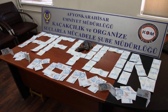 Afyonkarahisar'da bir iş yerinde sahte 100 TL vermeye çalışan bir şüpheli, uyanık esnafın dikkatini çekti. Esnaf, durumu hemen polise bildirdi. İhbar üzerine harekete geçen polis, şüpheliyi suçüstü yakaladı. Olayın ardından yapılan araştırmalar sonucunda, şüphelinin verdiği bilgilerle diğer 5 kalpazan daha tespit edildi. Yapılan operasyon sonucunda, bir araçta yapılan aramada sahte 100 TL'lerden oluşan toplam 6 bin TL ve bir ruhsatsız tabanca bulundu. Olayla ilgili soruşturma devam ediyor.